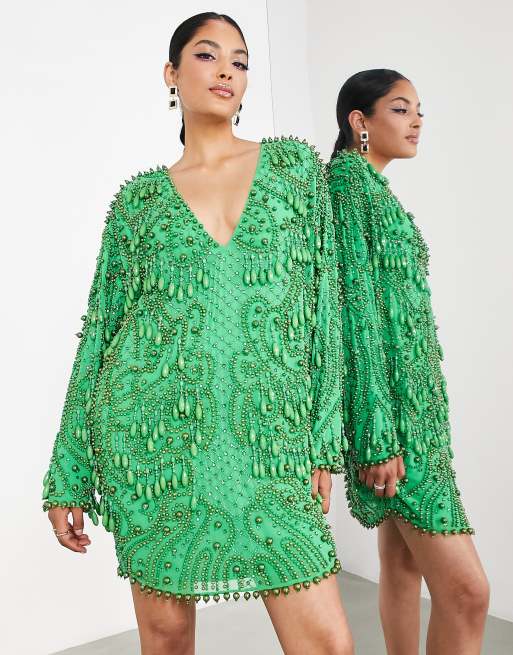 ASOS EDITION v neck embellished mini shift dress with teardrop beads in bright green Very well made.