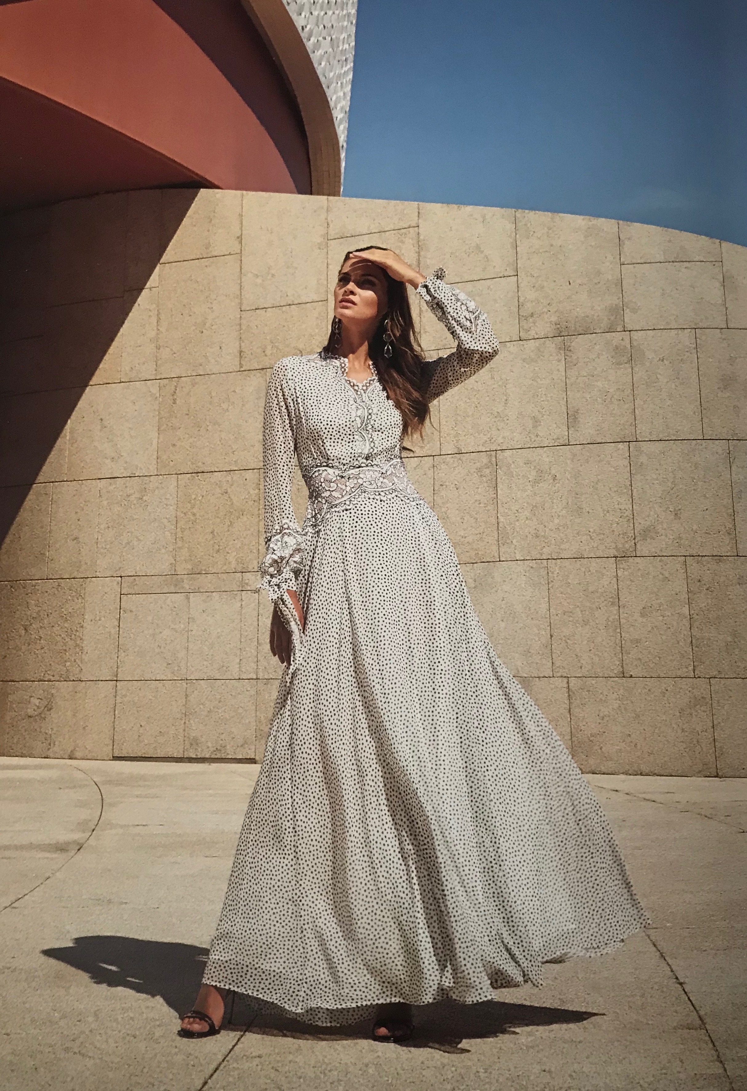 Abito lungo cerimonia donna bianco con pois neri ed inserti di Very well made.