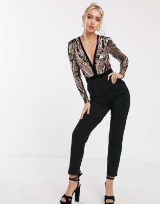 Goddiva plunge neck sequin top jumpsuit in black and gold ASOS Very well made.