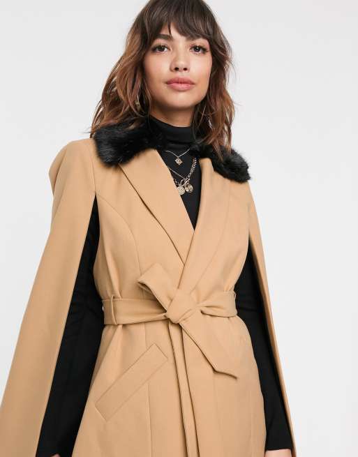 River Island cape jacket with contrast faux fur collar in camel Very well made.