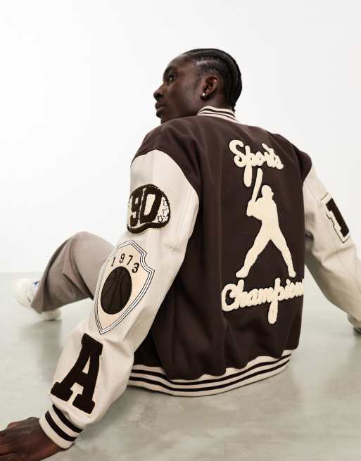 ASOS DESIGN oversized varsity bomber jacket in brown Very well made.
