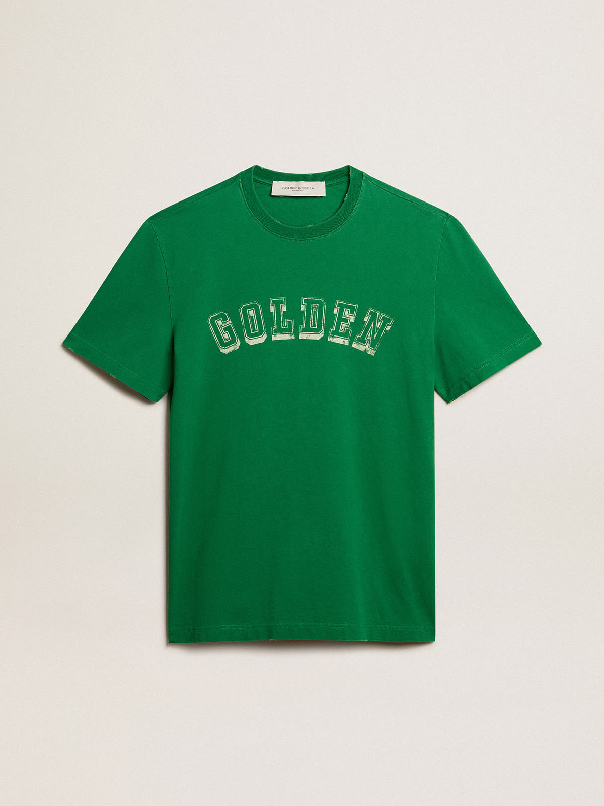 Men s green cotton T shirt with lettering at the center Golden Goose Very well made.
