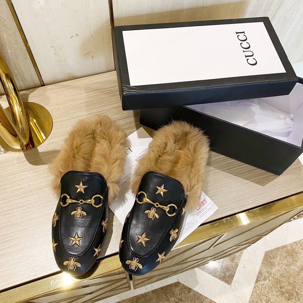 GUCCI Classic Real Fur Half Slippers Electric Embroidery Bee Star Very well made.