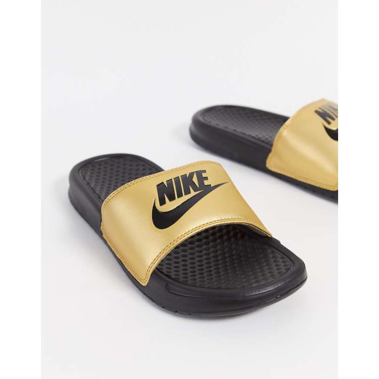 Nike Benassi JDI Slides Sandals Gold Black 343881 014 Women s Size Very well made.
