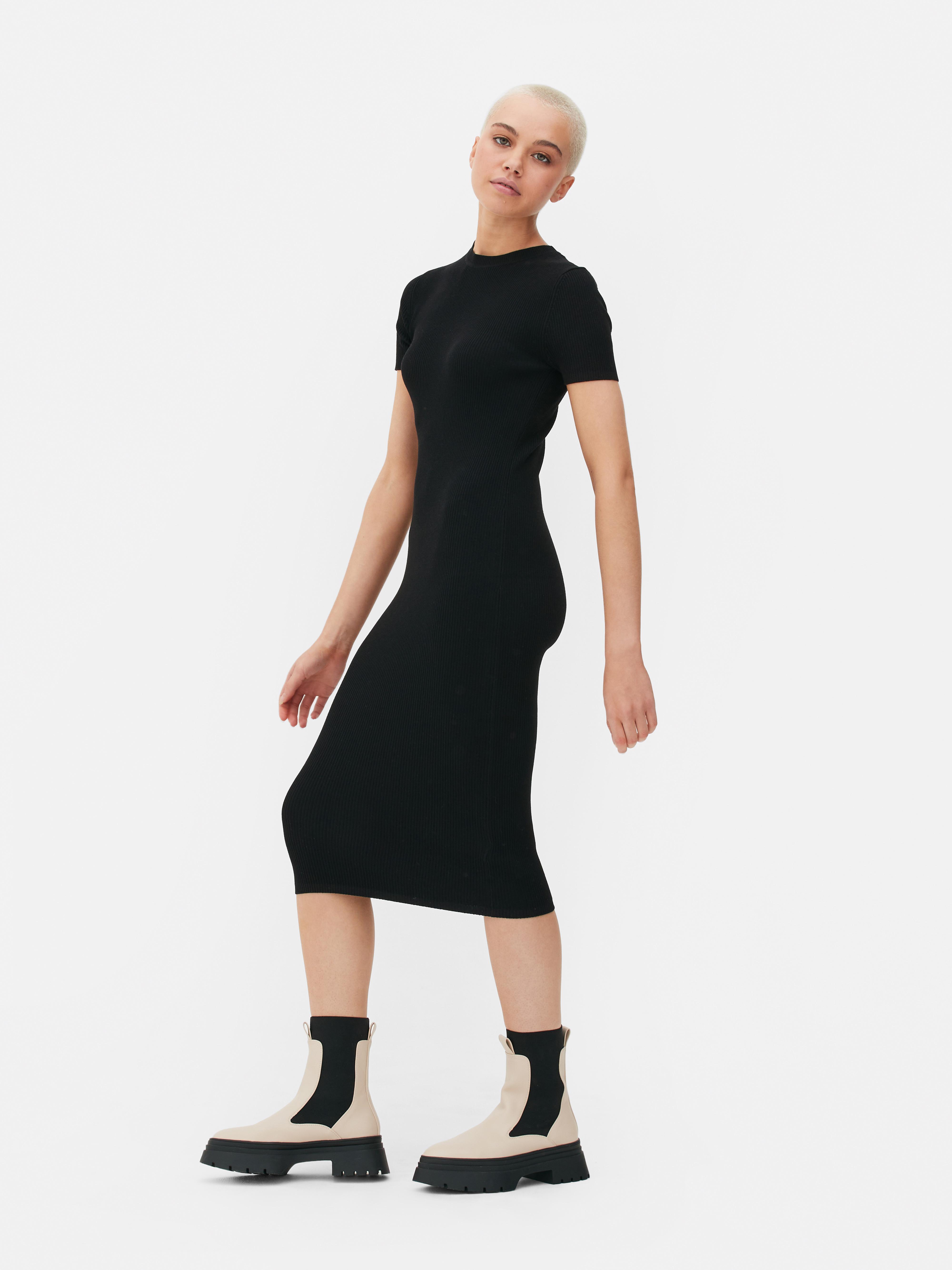 Womens Black Ribbed Short Sleeve Knit Midi Dress Primark Very well made.