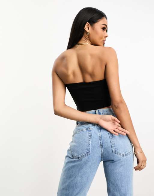 ASOS DESIGN curved plunge trim crop top in black Very well made.
