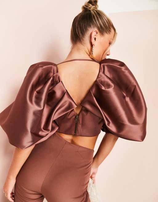ASOS LUXE co ord satin exaggerated puff sleeve plunge crop top in brown Very well made.