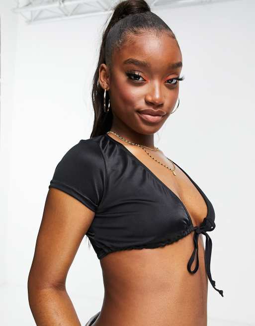Missguided tie front t shirt bikini top with plunge neck in black Very well made.