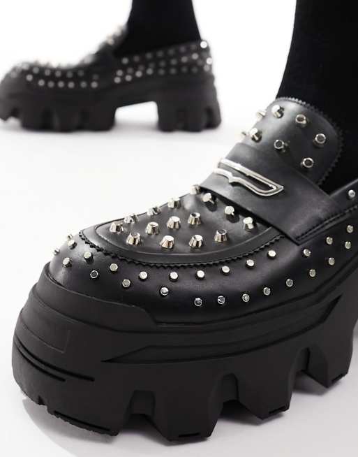 ASOS DESIGN chunky loafers in black faux leather with silver studs Very well made.